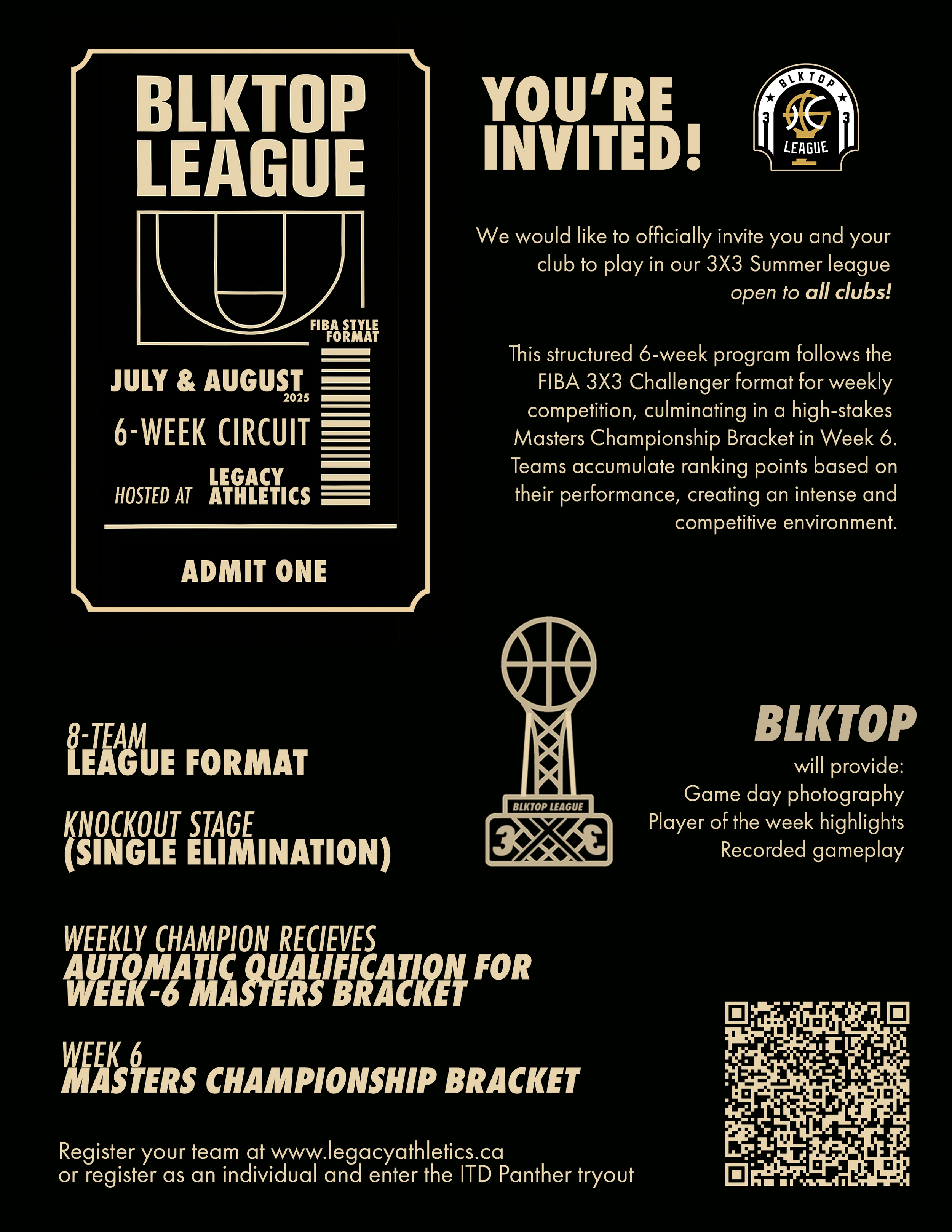 Overview: This structured 6-week program follows the FIBA 3x3 Challenger format for weekly competition, culminating in a high-stakes Masters Championship Bracket in Week 6. Teams accumulate ranking points based on their performance, creating an intense and competitive environment.